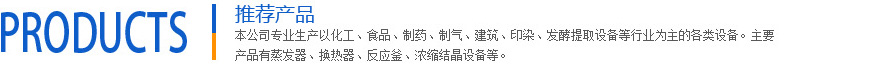 本公司專業生產以化工、食品、制藥、制氣、建筑、印染等行業為主的各類設備。主要產品有發(fā)酵提取設備,濃縮結晶設備,蒸發(fā)器、換熱器、反應釜、分離容器、儲罐、熱交換器、冷凝器,全自動供水設備、不銹鋼裝配式水箱、凝結水回收等各類壓力容器及非標產品。其中離心式刮板薄膜蒸發(fā)器獲江蘇省優(yōu)質產品。